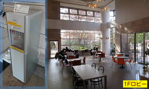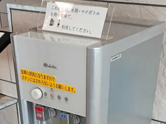給水機は、常温水と冷水が利用できる珍しいタイプです。薬を飲んだり、夏の乾いた喉を潤したりと、用途に応じたご利用が可能です。